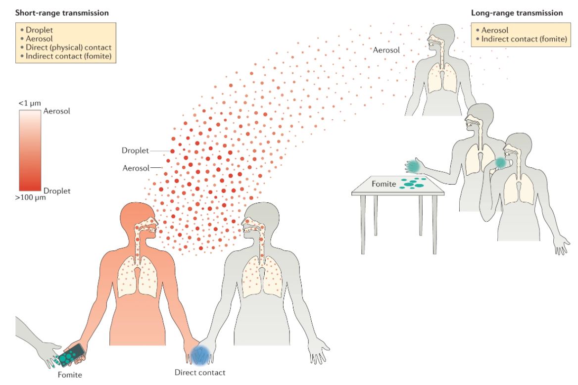 Mensen geven bij rustig ademhalen, spreken, zingen, sporten, hoesten en niezen ademhalingsdruppeltjes af van verschillende groottes. Deze druppeltjes kunnen virussen bevatten en infecties zoals CoViD-19 overdragen.