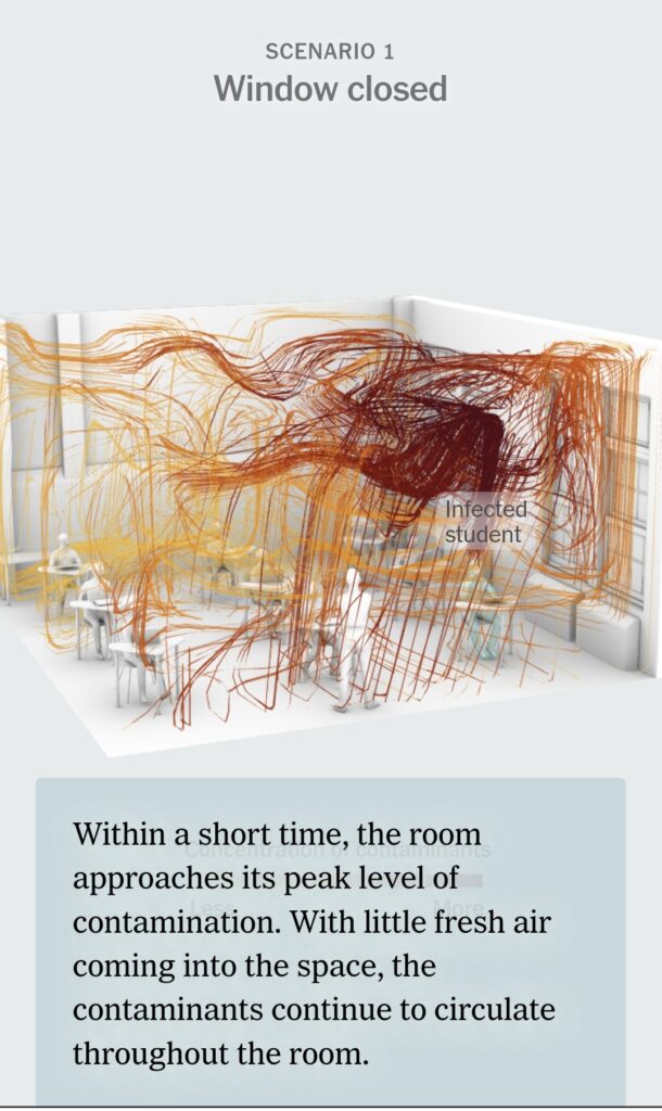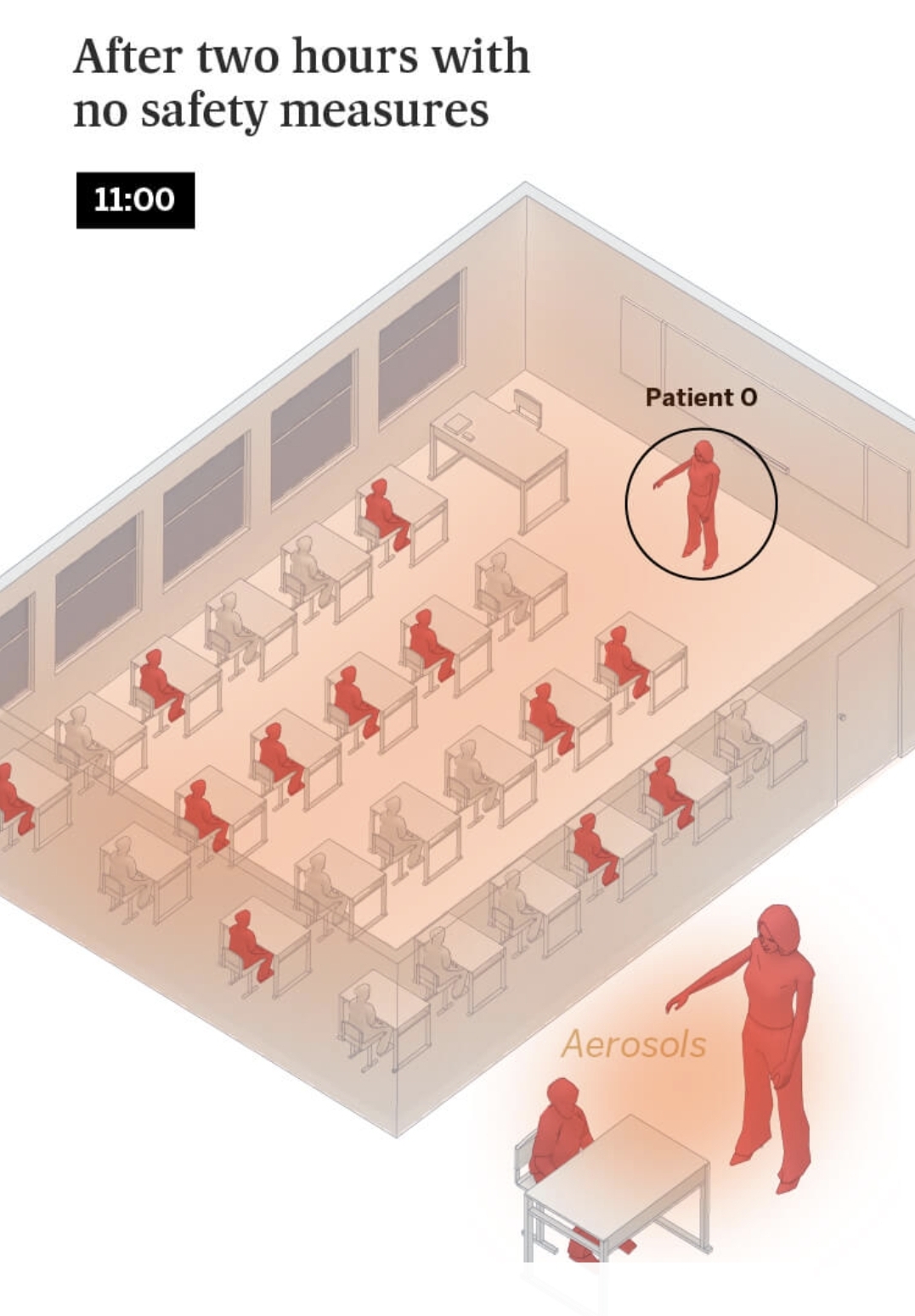 - Besloten ruimten met onvoldoende ventilatie waarbinnen de concentratie van uitgeademde ademhalingsvloeistoffen, vooral zeer fijne druppeltjes en aerosoldeeltjes, zich in de luchtruimte ophopen.