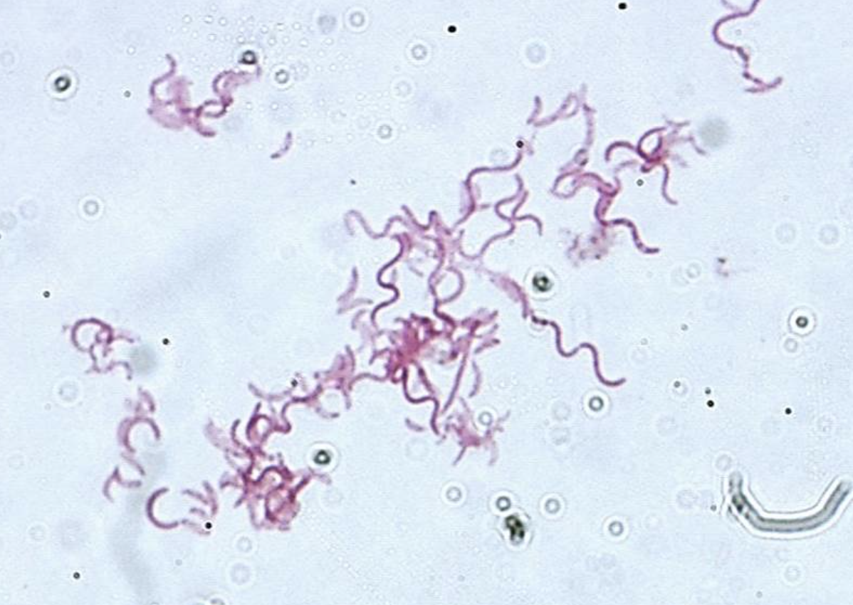 Deze bacterie is enigszins gebogen. Kommavormige bacteriën worden vibrionen genoemd. -